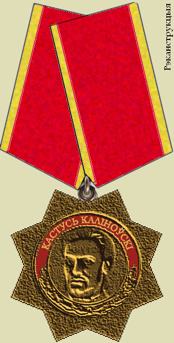 Рэканструкцыя Кузменкі ЗміцераОрдэн Кастуся Каліноўскага быў у ліку дзяржаўных узнагарод Беларусі ў 1995-2000 гг. Ніводнага кавалера Ордэна за гэты час не з'явілася, і, адпаведна, не было выраблена ніводнага яго асобніка. Усе спробы знайсці выяву (эскіз), паводле якое Ордэн зацвярджаўся, жаданага выніку не прынеслі. Таму прапануем увазе наведнікаў рэканструкцыю Ордэна Кастуся Каліноўскага, якая дае прыблізнае ўяўленне пра знешні выгляд узнагароды.