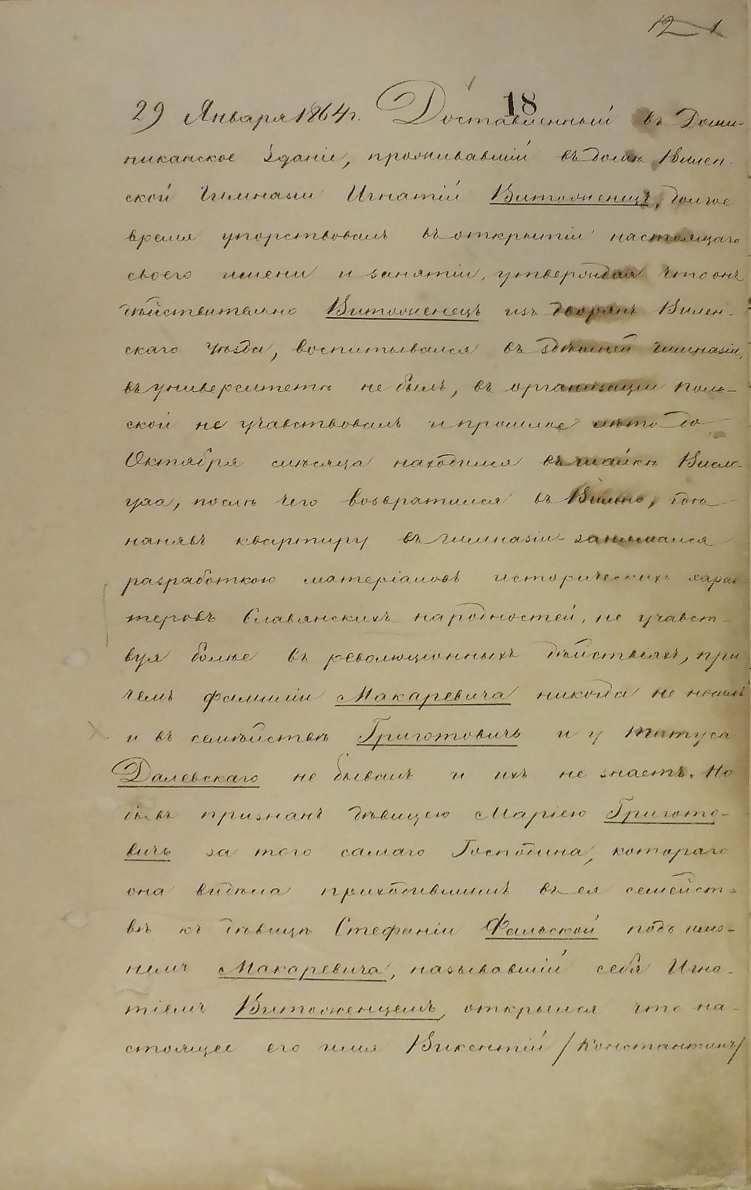 Доставленный въ Доминиканское зданіе1, проживавшій въ домѣ Виленской Гимназіи Игнатій Витоженец, долгое время упорствовалъ въ открытіи настоящаго своего имени и занятій, утверждая, что онъ дѣйствительно Витоженецъ изъ дворянъ Виленскаго уѣзда, воспитывался въ здѣшней гимназіи, въ университетѣ не былъ, въ организаціи польской не участвовалъ и прошлое лѣто до Октября мѣсяца находился въ шайкѣ Вислоуха, послѣ чего возвратился въ Вильно, гдѣ нанялъ квартиру въ гимназіи, занимался разработкою матеріаловъ историческихъ характеровъ Славянскихъ народностей, не участвуя болѣе въ революционныхъ дѣйствіяхъ, причемъ фамиліи Макаревича никогда не носилъ и въ семействѣ Григотовичъ и у Титуса Далевскаго не бывалъ и ихъ не знаетъ. Но бывъ признанъ дѣвицею Маріею Григотовичъ за того самаго Господина, котораго она видѣла приходившимъ въ ея семействѣ къ дѣвицѣ Стефаніи Фальской подъ именемъ Макаревича, называвшій себя Игнатіемъ Витоженцемъ,