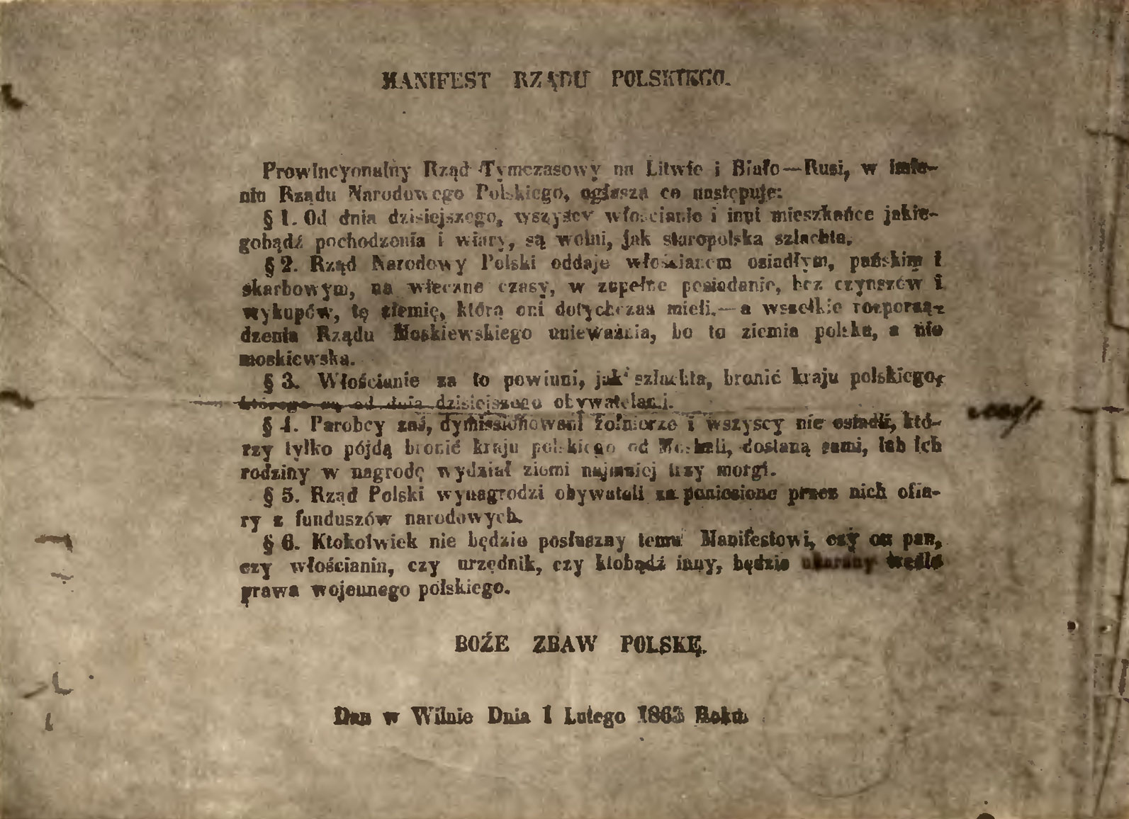 § 6. Калі хто не будзе паслушны гэтаму Маніфесту, ці ён пан, селянін, чыноўнік або хто іншы, будзе пакараны паводле польскіх ваенных законаў.