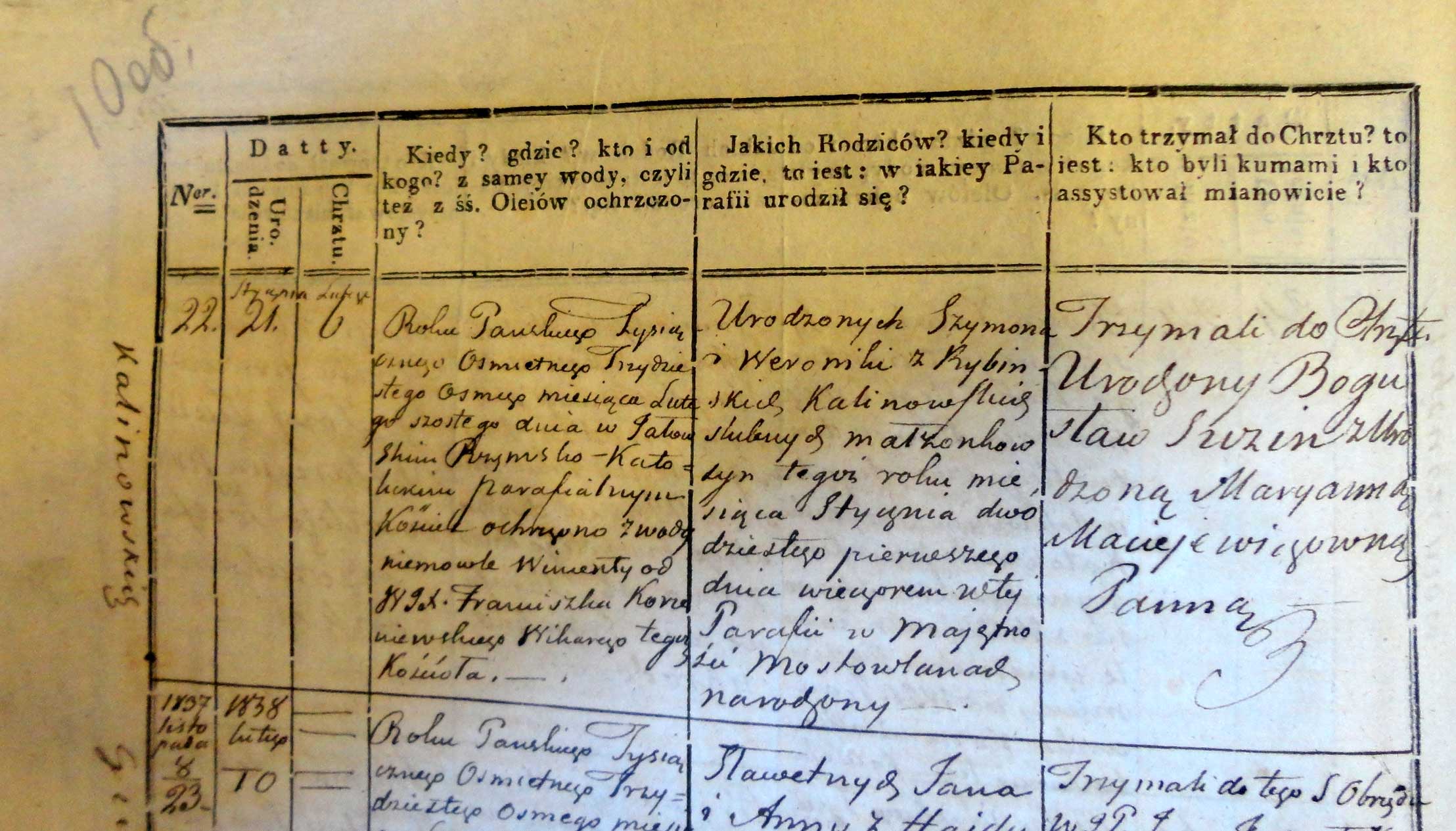 22 | Студзеня | Лютага | Году Божага тысяча васемсот трыццаць восьмага месяца Лютага шостага дня ў Ялоўскім рымска-каталіцкім парафіяльным касцёле ахрышчана вадою немаўля Вінцэнт Вялебным ксяндзом Францішкам Кажанеўскім, Вікарыем гэтага касцёла. | Шляхетных Сымона і Веранікі з Рыбінскіх Каліноўскіх шлюбных сужэнцаў сын, народжаны ў гэтым жа годзе месяца Студзеня дваццаць першага дня ўвечары ў маёнтку Мастаўляны той жа парафіі. | Хрысцілі шляхетны Багуслаў Сузін са шляхетнай Мар'янай Мацяевіч, дзяўчынай. |