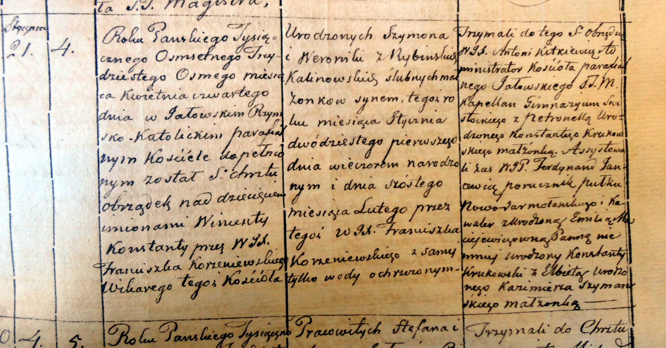 49 | Студзеня | [Красавіка] | Году Божага тысяча васемсот трыццаць восьмага месяца красавіка чацвёртага дня ў Ялоўскім рымска-каталіцкім парафіяльным касцёле быў завершаны абрад Св. Хросту над дзіцяткам імёнамі Вінцэнт Канстанцін Вялебным ксяндзом Францішкам Кажанеўскім, Вікарыем гэтага касцёла. | Шляхетных Сымона і Веранікі з Рыбінскіх Каліноўскіх, шлюбных сужэнцаў сынам, у гэтым жа годзе месяца Студзеня дваццаць першага дня ўвечар народжаным і шостага дня месяца лютага тым жа самым Вялебным ксяндзом Францішкам Кажанеўскім адной толькі вадою ахрышчаным. | Трымалі ў гэтым Св. Абрадзе Вялебны ксёндз Антоній Кіткевіч, Адміністратар Ялоўскага парафіяльнага касцёла, капелан Свіслацкай гімназіі з Петранелай, жонкай шляхетнага Канстанціна Крукоўскага. Асіставалі ж Вяльможны пан Фердынанд Янцэвіч, паручнік Нова-Ермаланскага палка, нежанаты, са шляхетнай Эміліяй Мацяевіч, дзяўчынай, такі самы шляхетны Канстанцін Крукоўскі з Эльбетай, жонкай шляхетнага Казіміра Шыманскага. |