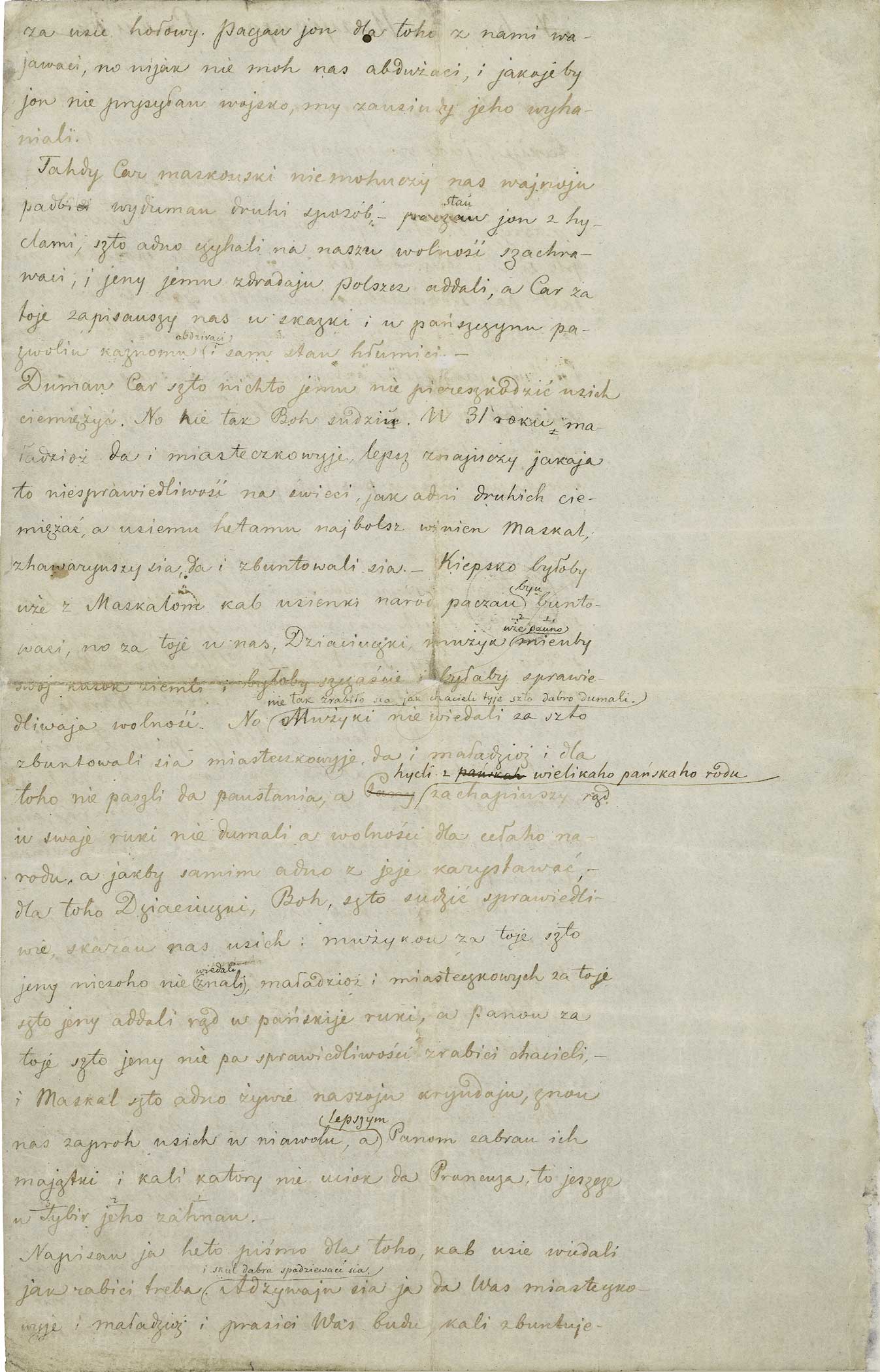 Дзяцючкі, братцы мае мужыцкага роду, слышыцца ўжэ той час, калі мы на векі расстанемся з маскоўскім здзерствам23, а вольнасць справядлівая будзе наградаю за нашу працу, за нашу кроў, што пральецца, вы[г]аняючы24 маскоўскую саранчу!