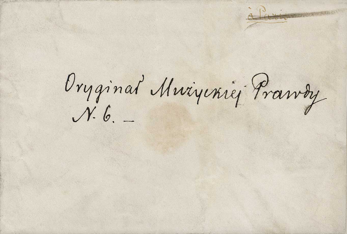 Атрамантам на трох аркушах стандартнага памеру, складзеных пазней у восем столак. Частка апошняга аркуша (вольная ад тэксту) адарваная. Пад польскамоўнай прыпіскай з дазволам на друк адбітак авальнай пячаткі Літоўскага правінцыйнага камітэта з выявай поціску рук і надпісам: “Odwaga Rozwaga”, а таксама манаграма, якая можа сведчыць пра аўтарства.