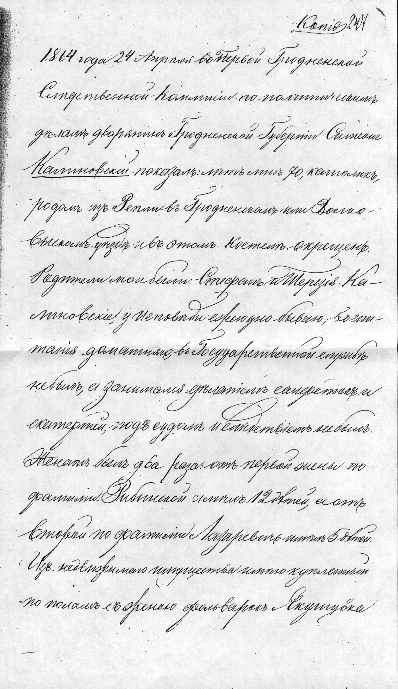 1864 г. Красавіка 24. - Паказанні Сымона Каліноўскага Першай Гародзенскай следчай камісіі па палітычных справах