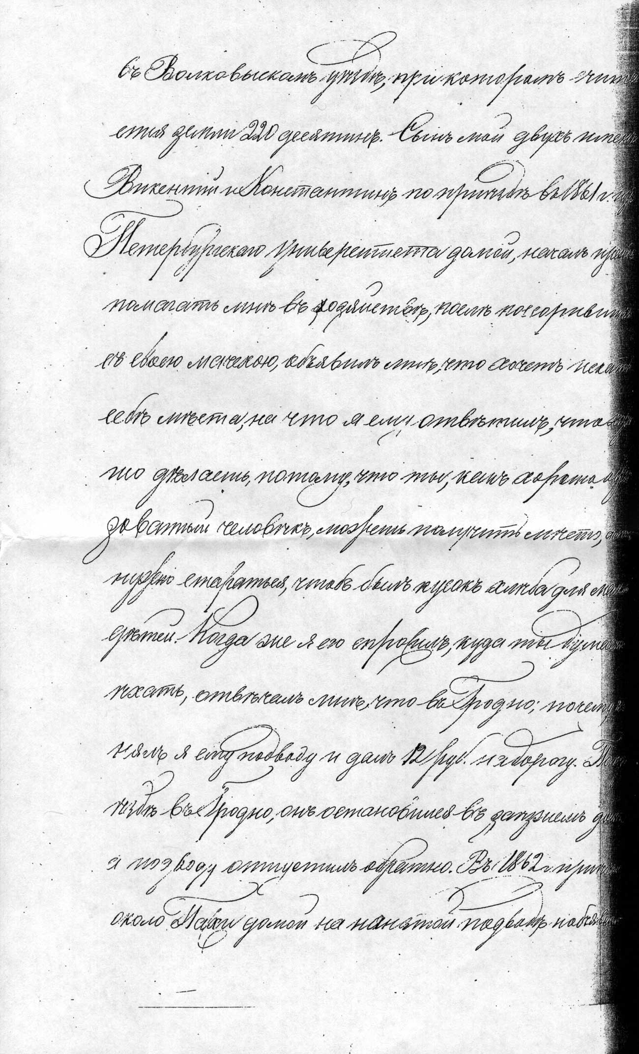 въ Волковыскомъ уѣздѣ, при которомъ считается земли 220 десятинъ. Сынъ мой двухъ именъ Викентій и Константинъ по приѣздзѣ въ 1861 г. изъ Петербургскаго университета началъ прежде помогать мнѣ въ хозяйствѣ, послѣ, поссорившись съ своею мачехою, объявилъ мнѣ, что хочетъ искать себѣ мѣста, на что я ему отвѣтилъ, что хорошо дѣлаешь, потому, что ты, какъ хорошо образованный человѣкъ, можешь получить мѣсто, а мнѣ нужно стараться, чтобъ былъ кусокъ хлѣба для малых дѣтей. Когда же я его спросилъ, куда ты думаешь ѣхать, отвѣчалъ мнѣ, что въ Гродно; почему нанялъ я ему подводу и далъ 12 руб. на дорогу. По приѣздѣ въ Гродно онъ остановился въ заѣзжемъ домѣ, а подводу отпустилъ обратно. Въ 1862 г. приѣхалъ около Пасхи домой на нанятой подводѣ