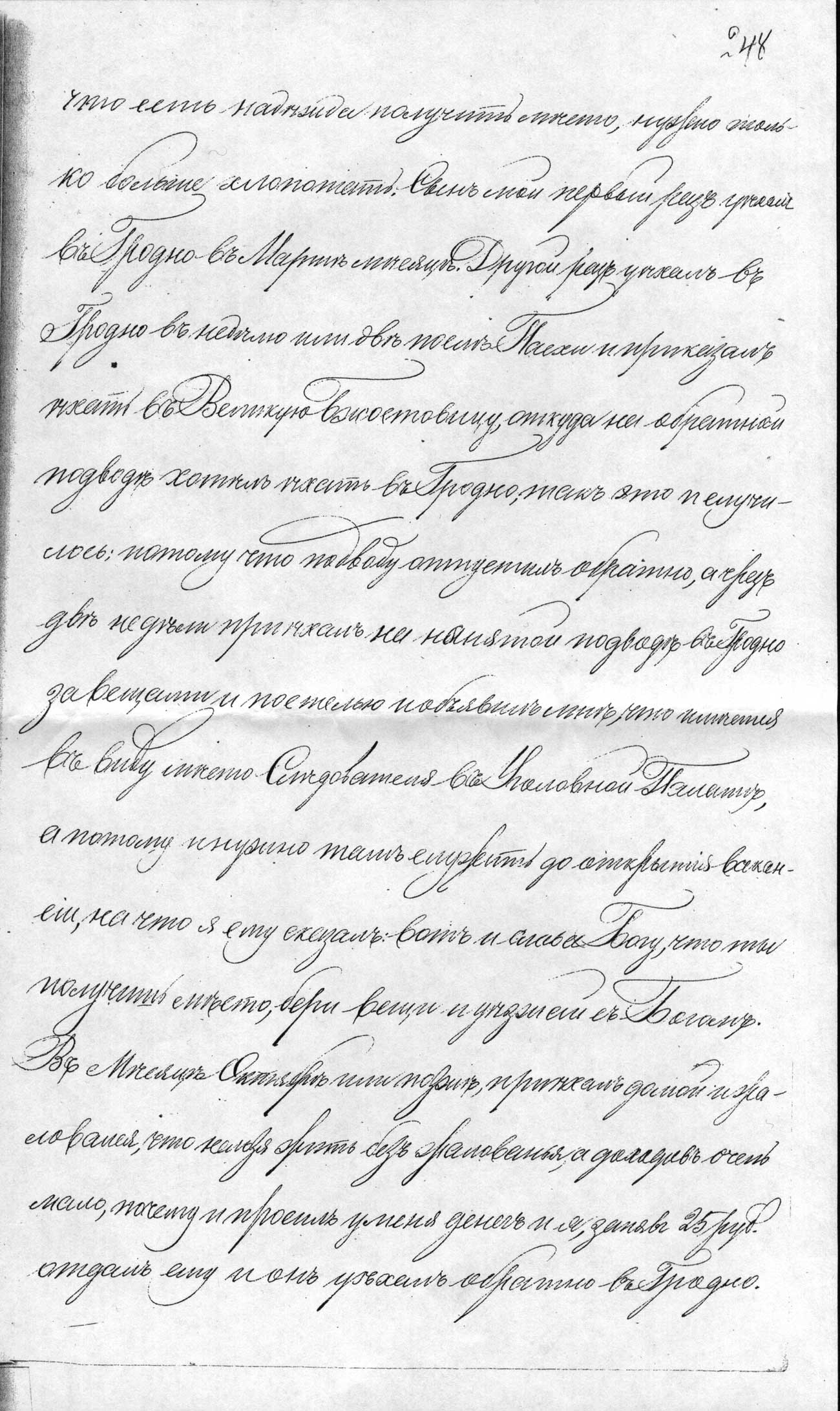 и объявилъ, что есть надѣжда получить мѣсто, нужно только больше хлопотать. Сынъ мой первый разъ уѣхалъ въ Гродно въ Мартѣ мѣсяцѣ. Другой разъ уѣхалъ въ Гродно въ недѣлю или двѣ послѣ Пасхи и приказалъ ѣхать въ Великую Бжостовицу, откуда на обратной подводѣ хотѣлъ ѣхать въ Гродно, такь это и случилось, потому что подводу отпустилъ обратно, а чрезъ двѣ недѣли приѣхалъ на нанятой подводѣ въ Гродно за вещами и постелью и объявилъ мнѣ, что имѣется въ виду мѣсто Слѣдователя въ Уголовной Палате, а потому и нужно тамъ служить до открытія вакансіи, на что я ему сказалъ: вотъ и слава Богу, что ты получишь мѣсто, бери вещи и уезжай съ Богомъ. Въ Мѣсяцѣ Октябрѣ или позжѣ, приѣхалъ домой и жаловался, что нельзя жить безъ жалованья, а доходовъ очень мало, почему и просилъ у меня денегъ, и я, занявъ 25 руб., отдалъ ему, и онъ уѣхалъ обатно въ Гродно.