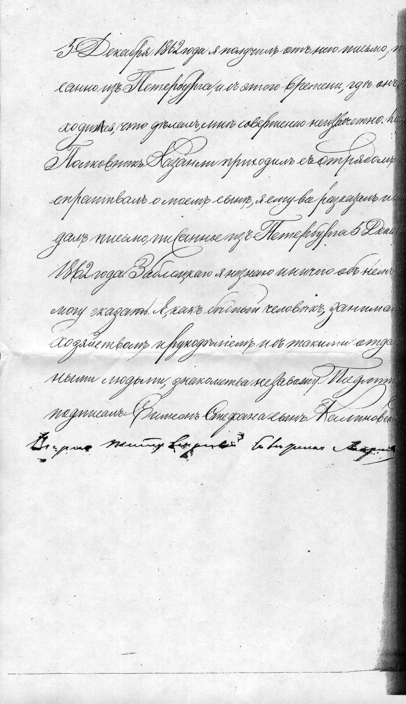 5 Декабря 1862 года я получилъ отъ него письмо, писанно изъ Петербурга, и съ этого времени, гдѣ онъ находился1, что дѣлалъ, мнѣ совершенно неизвѣстно. Когда Полковникъ Казанли приходилъ съ отрядомъ и спрашивалъ о моемъ сынѣ, я ему все разказалъ и отдалъ письмо, писанное изъ Петербурга 5 Декабря 1862 года. Заблоцкаго я не знаю и ничего объ немъ не могу сказать. Я, какъ бѣдный человекъ, занимался хозяйством и рукодѣліемъ и с такими отдаленными людьми знакомства не завожу. Подлинникъ подписалъ: Симеонъ Стефана сынъ Калиновскій.