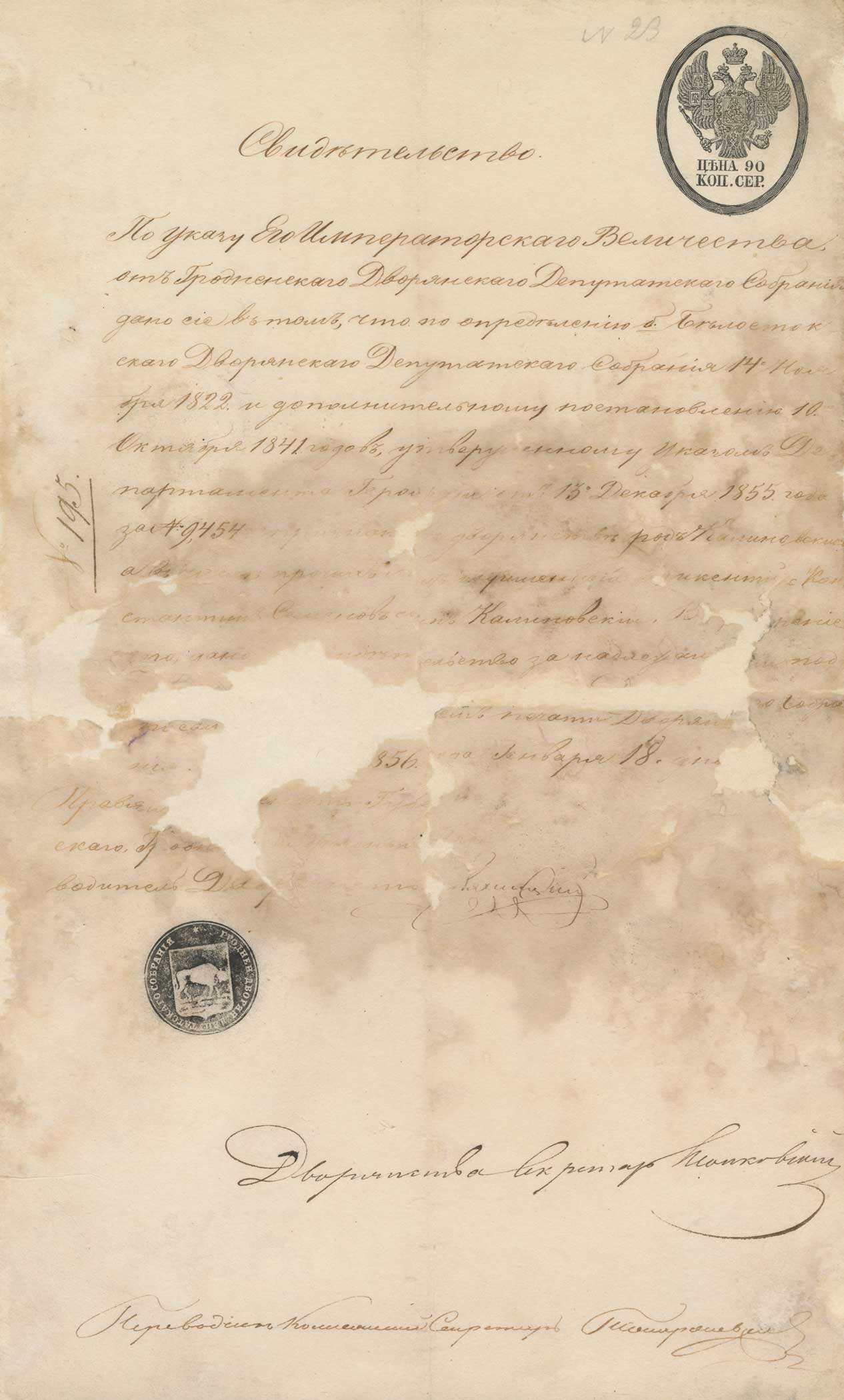 На гербавай паперы коштам 90 капеек срэбрам. Унізе адбітак круглай пячаткі шляхецкай дэпутацкай зборні з гербам Гарадзенскай губерні і надпісам па акружнасці: “Гроднен.[скаго] дворян.[скаго] депутатскаго собранія”.