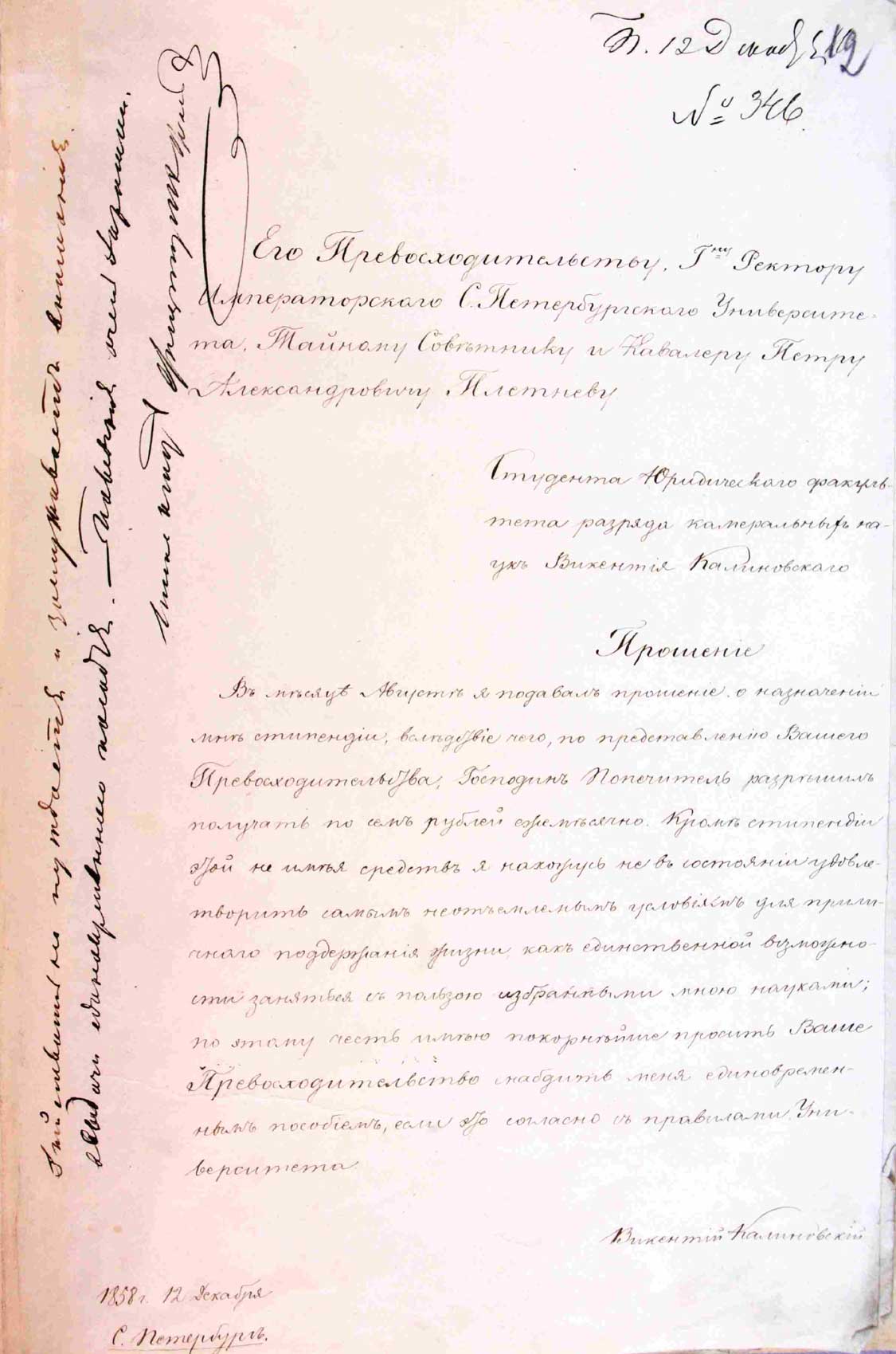 Въ мѣсяцѣ Августѣ я подавалъ прошеніе о назначеніи мнѣ стипендіи, вслѣдствіе чего, по представленію Вашего Превосходительства, Господинъ Попечитель разрѣшилъ получать по семь рублей ежемѣсячно. Кромѣ стипендіи этой не имѣя средствъ, я нахожусь не в состояніи удовлетворить самымъ неотъемлемымъ условіямъ приличнаго поддержанія жизни как единственной возможности заняться съ пользою избранными мною науками; по этому честь имѣю покорнѣйше просить Ваше Превосходительство снабдить меня единовременнымъ пособіемъ, если это согласно съ правилами Университета.