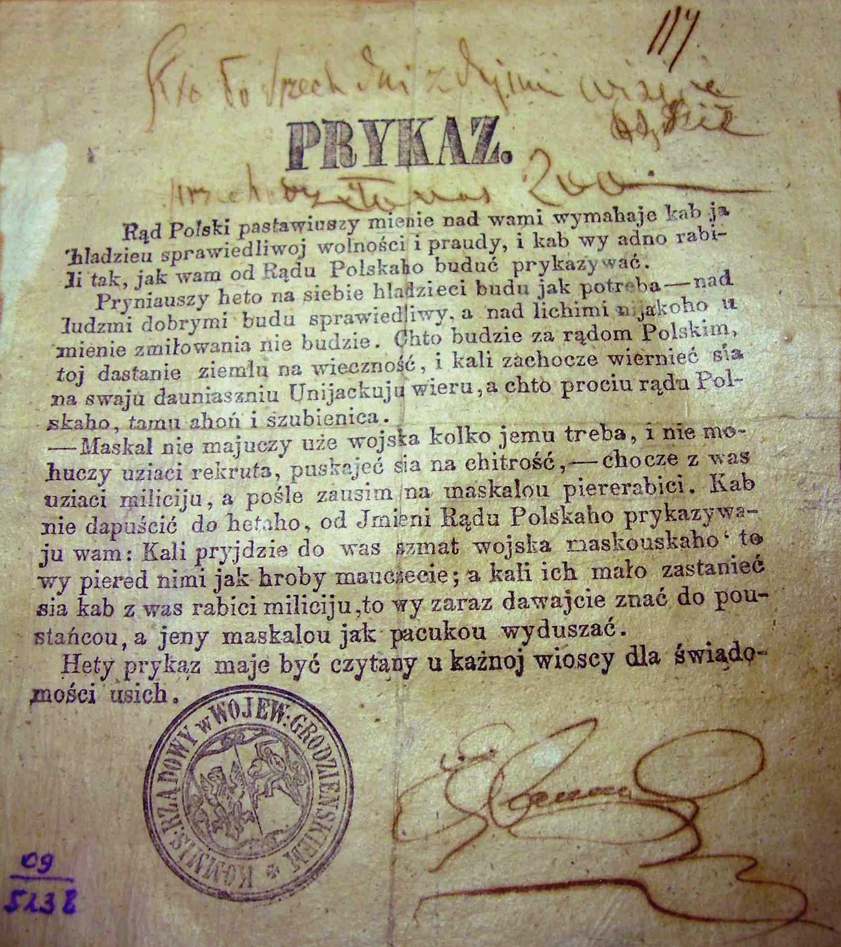 Маскаль*, не маючы ўжэ войска, колькі яму трэба, і не могучы ўзяці рэкрута, пускаецца на хітрасць — хоча з вас узяці міліцыю, а пасля заўсім на маскалёў* перарабіці. Каб не дапусціць да гэтага, ад Імені Ронду* Польскага прыказваю вам: Калі прыйдзе да вас шмат войска маскоўскага, то вы перад імі, як грабы, маўчыце, а калі іх мала застанецца, каб з вас рабіці міліцыю, то вы зараз давайце знаць да паўстанцаў, а яны маскалёў*, як пацукоў, выдушаць.