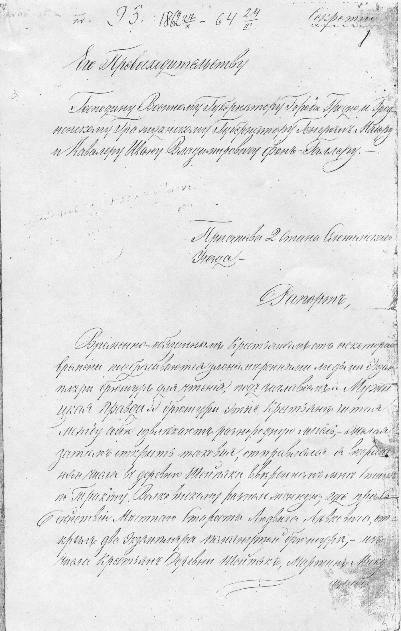 Временно-обязаннымъ крестьянамъ отъ некотораго времени подбрасываются злонамеренными людьми экземпляри брюшур2 для чтенія подъ заглавіемъ “Мужицкая Правда”. Брюшуры этые крестьянѣ читая, между собою извлѣкаютъ разнородную мысль. Желая затѣмъ открыть таковыя, отправлялся я вчерашняго числа въ деревню Шейпяки въ ввѣренномъ мнѣ станѣ по тракту Волковыскому разположенную, гдѣ при содѣйствіи мѣстнаго старосты Людвига Лѣвковича открылъ два экземпляра помянутой брюшуры. Изъ числа крестьян деревни Шейпяки Мартинъ Микуцинъ,