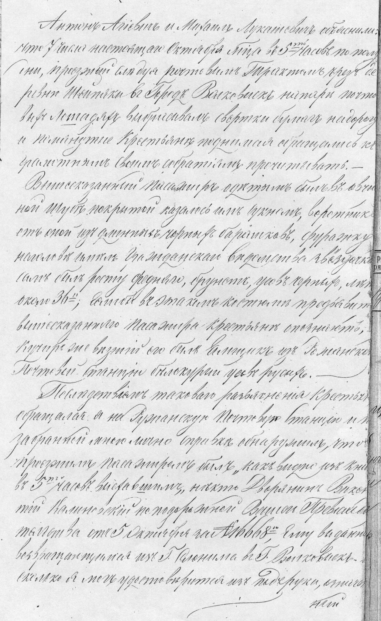 Антонъ Агіевичъ и Михаилъ Лукашевичъ объяснили, что 7 числа настоящаго октября м[еся]ца въ 5ть часовъ пополудни проезжий, слѣдуя почтовымъ трактомъ чреъ деревню Шейпяки въ городъ Волковыскъ на паре почтовыхъ лошадяхъ, выбрасывалъ свертки бумагъ на дорогу, а помянутые крестьянѣ, поднимая, обращались къ грамотнымъ своимъ собратіямъ прочитывать.