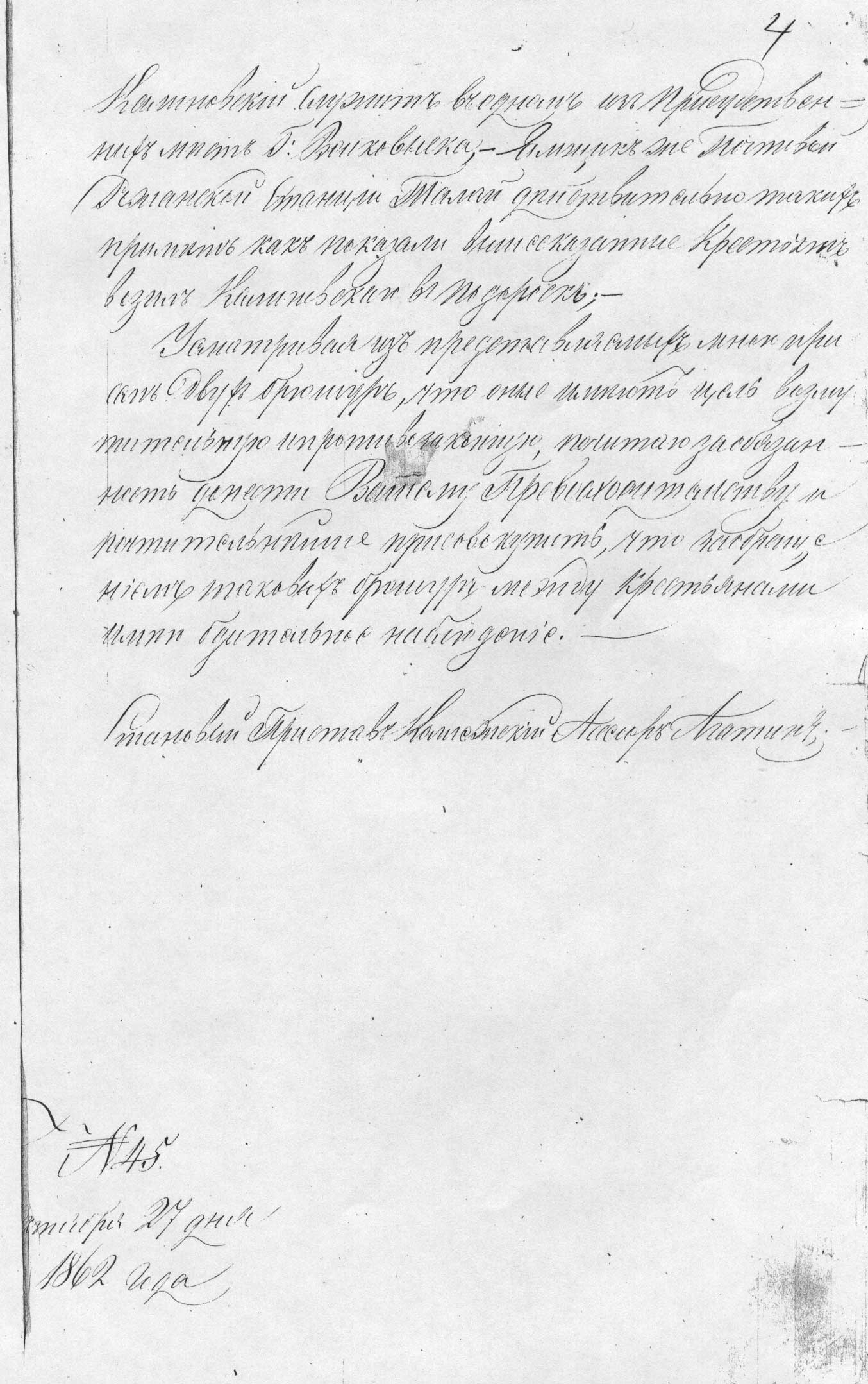 Усматривая изъ предоставляемыхъ мною при семъ двухъ брюшуръ, что оные имеютъ цель возмутительную и противозаконную, почитаю за обязанность донести Вышему Превосходительству и почтительнѣйше присовокупить, что за обращеніемъ таковыхъ брошуръ между крестьянами имѣю бдительное наблюденіе.