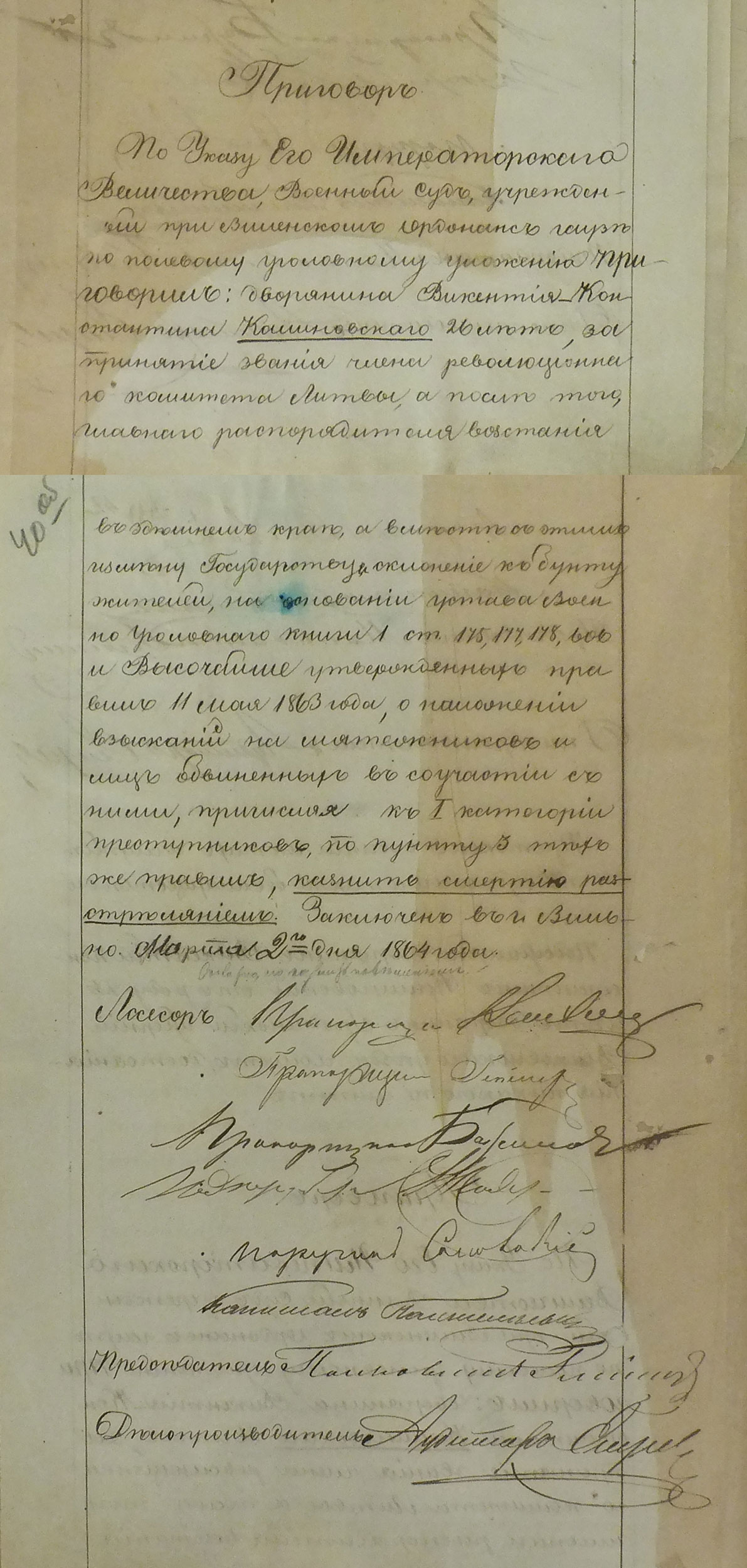 По Указу Его Императорскаго Величества, Военный Суд, учрежденный при Виленскомъ Ордонансъ гаузѣ по полевому уголовному уложенію ПРИГОВОРИЛЪ: дворянина Викентія-Константина Калиновскаго 26 лѣтъ, за принятіе званія члена революціоннаго комитета Литвы, а послѣ того, главнаго распорядителя возстанія въ здѣшнемъ краѣ, а вмѣстѣ съ этимъ измѣну Государству и склоненіе къ бунту жителей, на основаніи устава Военно Угололовнаго книги 1 ст.[атей] 175, 177, 178, 606 и Высочайше утвержденныхъ правилъ 11 мая 1863 года о наложеніи взысканій на мятежниковъ и лицъ, обвиненныхъ въ соучастіи съ ними, причисляя къ І категоріи преступниковъ, по пункту 3 тѣхъ же правилъ, казнить смертію разстрѣляніемъ. Заключено въ г.[ородѣ] Вильно Марта 2го дня 1864 года.