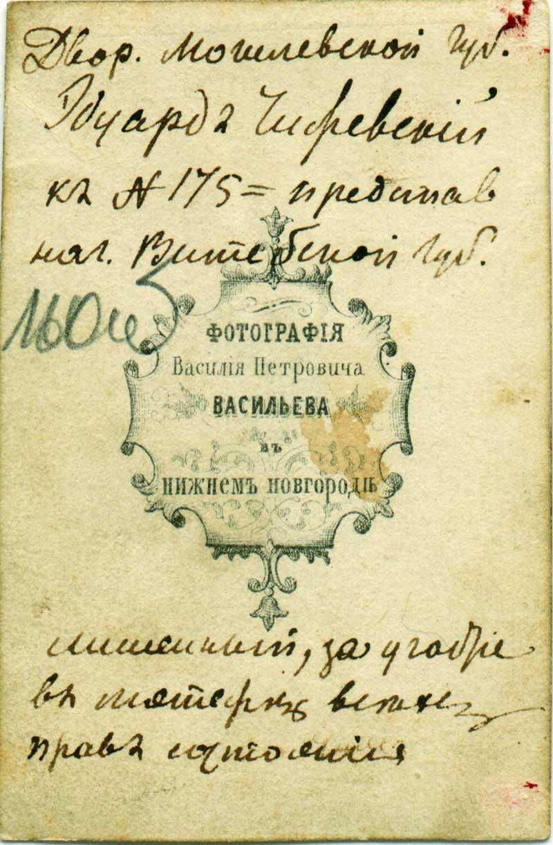 | Эдуард Чыжэўскі Каля 1863 г. Ніжні Ноўгарад. Фотамайстэрня В. П. Васільева. (LVIA, f. 439, ap. 1, b. 148, l. 160-160 v.) | ||