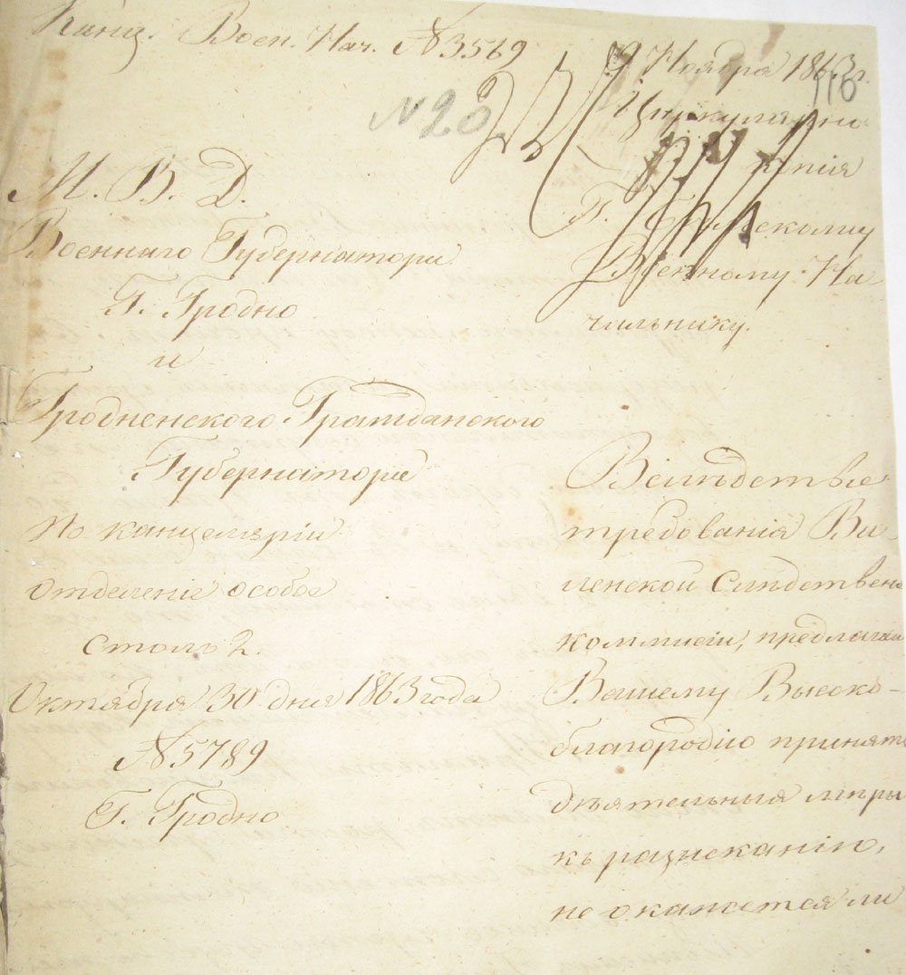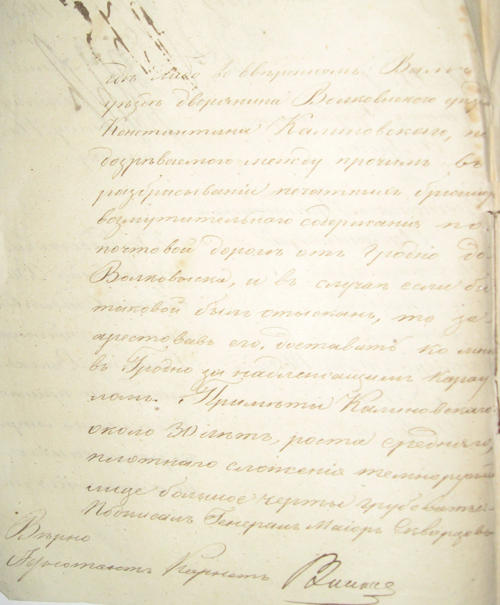 Вследствие требования Виленской следственной коммисии, предлагаю Вашему Высокоблагородию принять деятельныя меры к разысканию, не окажется ли где либо во вверенном Вам уезде дворянина Волковыского уезда Константина Калиновскаго, подозреваемого между прочим в разбрасывании печатных брюшюр возмутительнаго содержания по почтовой дороге от Гродно до Волковыска, и в случае если бы таковой был отыскан, то заарестовав его, доставить ко мне в Гродно за надлежащим караулом24. |