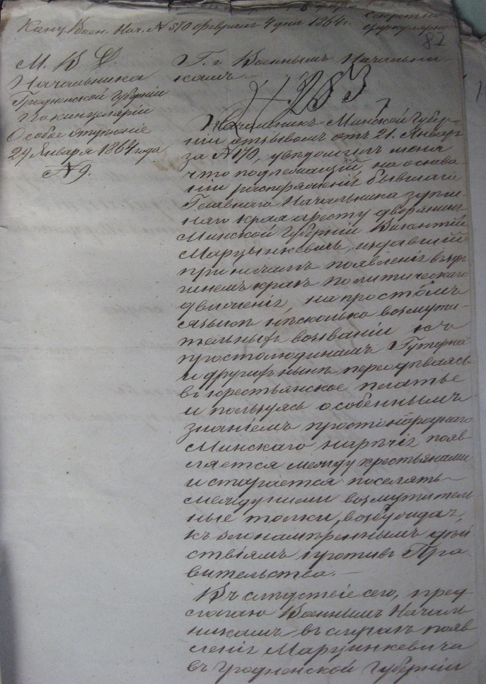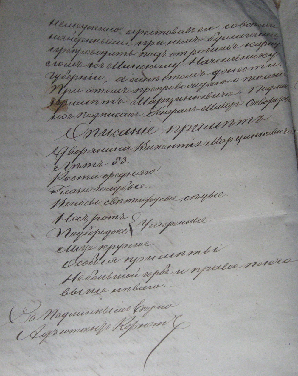 Начальник Минской губернии... уведомил меня что подлежащий, на основании распоряжений бывшаго Главнаго Начальника здешняго края аресту дворянин Минской губернии Викентий Марцынкевич, издавший при начале появления в здешнем крае политическаго движения, на простом языке несколько возмутительных возваний к простолюдинам Гуторка и других ныне переодеваясь в крестьянское платье и пользуясь особенным знанием простонароднаго Минскаго наречия появляется между крестьянами и старается поселять между ними возмутительные толки, возбуждая к злонамеренным действиям против Правительства. В следствие сего, предлагаю Военным Начальникам в случае появления Марцинкевича в Гродненской губернии немедленно арестовав его со всеми найденными при нем бумагами препроводить под строгим караулом к Минскому Начальнику губернии, а мне о том донести. При этом припроваждаю описание примет Марцинкевича... Лет 53. Роста средняго. Глаза голубые. Волосы светлорусые седые. Нос, рот, подбородок умеренные. Лицо круглое. Особыя приметы: небольшой горб и правое плечо выше леваго25. |